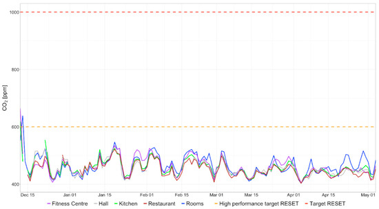 CO2 concentrations resulted consistently below the target concentrations required by the RESET standards and appear quite aligned across the different environments monitored. Only during the first days of the study did we register CO2 concentrations exceeding the standards proposed, up to levels never replicated afterward. The mean values differed by less than 2.5% and the standard deviations exceeded the 10% of the mean only for the rooms.