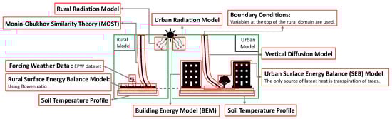 Few models are available in the literature that partially account for the interaction between buildings and the outdoor conditions. For example, the Urban Weather Generator (UWG) is forced with rural meteorological data and calculates the bulk flow dynamics in an urban canyon, while considering the momentum, energy, and humidity exchanges with the building and its energy systems and the outside environment [30,31,32,33,34,35,36,37,38]. The Vertical City Weather Generator (VCWG) enhanced the capabilities of UWG by resolving climate variables in the vertical direction in the urban environment [39]. The Temperatures of Urban Facets-3D (TUF-3D) model calculates urban surface temperatures with the main focus on three-dimensional radiation exchange, and it is forced by meteorological data on top of its domain, while it does not consider building energy [40]. More recently TUF-3D was coupled to an Indoor-Outdoor Building Energy Simulator (TUF-3D-IOBES) accounting for building energy interactions [41]. The multi-layer Building Effect Parametrization-Tree (BEP-Tree) model includes variable building heights, the vertical variation of climate variables, and the effects of trees, but it is not linked to a building energy model [42,43,44]. More recently, the BEP model has been coupled to a Building Energy Model (BEP + BEM) but it is forced with meteorological variables from higher altitudes above a city using meso-scale models, instead of near-surface meteorological variables measured outside the city (rural areas).