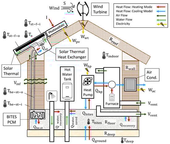 System configuration to reduce building sensible heating/cooling loads and water heating load via integration of Solar Thermal (ST), PhotoVoltaic (PV), Wind Turbine (WT), Building Integrated Thermal Energy Storage (BITES) system, Phase Change Material (PCM), Heat Pump (HP), and heat recovery systems as well as the utlization of ground thermal energy.