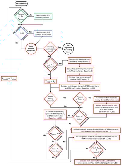 The control design for thermally-activated buildings is very important via the setting of temperatures, mass flow rates, and operation of various building systems [10]. Figure 3 shows the control algorithm for the system under heating mode. The ST collector attempts to heat the BITES system and raise its temperature when solar thermal energy is available. If BITES is to be used as a heat source for the HP, then the BITES temperature determines the of HP. Furthermore, the fraction of the sensible heating demand to be supplied by the HP is determined using this temperature-dependent . The BITES system is not permitted to reach a temperature below the minimum temperature required for the HP to operate. If this occurs, or if any fraction of heat is not to be supplied by the HP, then the required heating demand is supplied by the standard heating furnace that relies on natural gas. Heat recovery from the exhausted ventilated air is possible if the exit indoor air temperature is greater than the BITES temperature. A key variable to track is the fraction of the PCM that is melted. If this fraction is between 0 and 1, the heat exchanged with the PCM occurs by either melting the PCM (adding heat to BITES) or solidifying PCM (extracting heat from BITES) while keeping the BITES temperature the same. If the fraction of melted PCM reaches 0, there is no more solidification possible, where the removed heat will contribute to lowering the BITES temperature by sensible cooling. Likewise, if the fraction of the melted PCM reaches 1, there is no more melting possible, where the added heat will contribute to increasing the BITES temperature by sensible heating. The amount of heat used from BITES for water heating is determined by the building water usage schedule and the water inlet temperature. The BITES system can only warm up the water to its current temperature, while any further heating of the water must be achieved by auxiliary natural gas combustion in the hot water tank. Heat recovery by used domestic water is achieved if waste water temperature is greater than the BITES temperature. The ground heat flux is computed and its effect on BITES temperature or PCM melt fraction is accounted for.