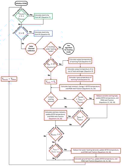 Figure 4 shows the control algorithm for the system under cooling mode. The ST collector attempts to cool the BITES system and lower its temperature when thermal energy can be lost via the collector. If BITES is to be used as a heat sink for the HP, then the BITES temperature determines the for the HP. Furthermore, the entire amount of sensible cooling demand is set to be met by the HP using this temperature-dependent coefficient of performance. The BITES system is not permitted to reach a temperature above the maximum temperature required for the HP to operate. If this occurs, the standard air conditioning unit is operated. Heat recovery from the exhaust ventilated air is possible if the exit indoor air temperature is less than the BITES temperature. The same logic holds for utilizing PCM and water heating under the cooling mode as in the heating mode. There is no heat recovery from used domestic water under cooling mode. The ground heat flux is computed and its effect on BITES temperature or PCM melt fraction is accounted for.