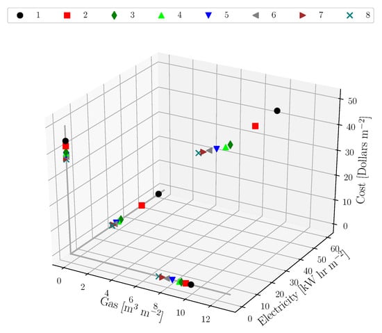 The examination of Figure 5, Figure 6, Figure 7 and Figure 8 reveal an optimization path for the building systems using 3D and 2D visualizations. It is seen that the objective function concerning electricity consumption E [kW hr m] can be reduced significantly, mainly due to the benefits of using PV technology, while it is more difficult to reduce the objective functions associated with gas consumption G [m m] and cost C [$ m]. Nevertheless, the path shows that all three objective functions can be reduced.
