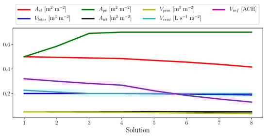 In the remaining iterations, 5 to 8, the design parameters continue to change. Some design parameters continue to decrease, such as , , , and , with decreasing the most. No change in the swept area of wind turbine is required for the same reason mentioned above. Other design parameters involving the building envelop resistance values , , and increase most substantially (accompanied by decreasing envelop thermal conductivities). Although some parameters had not reached their constraints, the optimization process was stopped after eight iterations since the magnitude of reached below 0.1 or 10% after eight iterations and that most parameters reached practical limits.