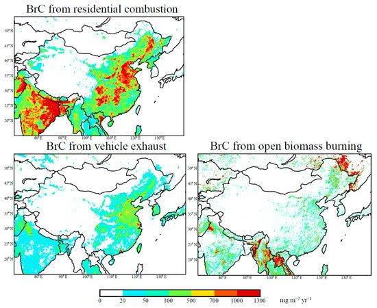 Most of the previous model studies either neglect BrC or simply use OC from biomass burning as a proxy of BrC. In this study, we consider three major primary sources of BrC: residential combustion (including coal and biofuel), vehicle exhaust, and open biomass burning, which are currently reported as being potentially large BrC sources [23,28,32]. Due to the lack of emission inventories, the emissions of BrC awee estimated based on the emission ratios of BrC versus BC (EBrC/BC) combined with BC emissions for different sources. Assuming that the atmospheric process of BrC is similar to BC, the atmospheric concentrations of BrC emitted from each source could be estimated as the product of the corresponding EBrC/BC and BC concentrations, as the simulation of BC in GEOS-Chem is linear (i.e., concentrations are proportional to emissions). The calculation of total BrC concentrations can then be described by Equation (1):
