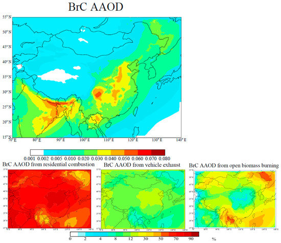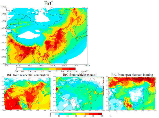 Simulated annual mean surface concentrations of BrC as well as the relative contribution from the specific source, i.e., residential combustion, vehicle exhaust, and open biomass burning.