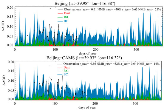 Simulated AAOD in GEOS-Chem includes the contribution from BrC, BC, and dust. To evaluate the model results for BrC, we also compared model AAOD at 365 nm (with and without the contribution of BrC) with observed AAOD at 440 nm from AERONET sites (level 2.0 daily data [44]). Due to a limited number of valid observations in the year of 2018, only the data from two AERONET sites in Beijing were utilized for the comparison (Figure 3). The comparison shows a better agreement between AERONET and model AAOD at both sites after including the absorption of BrC resulting in the normalized mean bias (NMB) decreasing from −30~−32% to 14~21%. The slight overestimations could be attributed to the difference in the wavelength as the absorption decreases with the wavelength. As a result, it is expected to be higher at 365 nm than at 440 nm. The correlation coefficient r is similar at Beijing site and increases from 0.56 to 0.64 at Beijing-CAMS site. Simulated contribution of BrC to total AAOD at 365 nm at the two sites is about 22%. The comparison implies the importance of considering BrC absorption with regard of the estimates of AAOD in China.