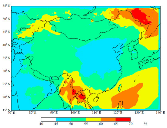 Compared with other sources, residential combustion is the main source of BrC in China, accounting for 60% of total surface BrC concentrations in China. This result could be explained by the wide usage of biofuel and coal for cooking and heating, especially in rural regions, combined with high BrC emissions due to low combustion efficiency and little emission control. High contributions (>70%) are generally found in Central China. Vehicle exhaust accounts for 17% of surface BrC on average, with relatively higher contributions found in Beijing, Yangtze River Delta, and Pearl River Delta (>40%). Open biomass burning accounts for 23% of surface BrC on average, with maximums on the northeastern and southwestern border of China (40–90%), probably due to biomass burning in neighboring countries. There is also relatively high open biomass burning contribution in Fujian province, reaching up to 50%. This is consistent with previous studies, which show abundant BrC aerosols transported from Southeast Asia (e.g., Indochina) to southern China, especially in spring, due to intensive biomass burning there, associated with southwesterly wind [11,41,42,43].
