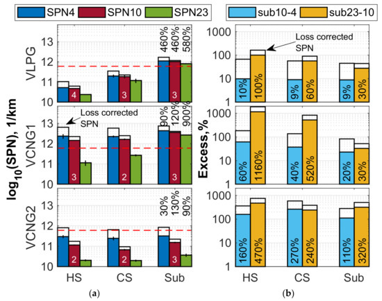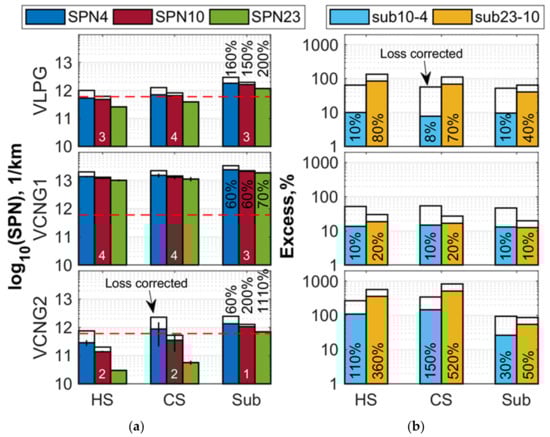 Solid particle number (SPN) emissions of the three vehicles VLPG (top), VCNG1 (middle) and VCNG2 (bottom) for 23 °C hot start (HS), 23 °C cold start (CS) and sub-zero (Sub) cold start WLTC for gaseous fuel operation: (a) SPN4, SPN10 and SPN23 emissions. Black edge bars represent the particle loss corrected values (see Section 2.2). Red dashed lines show the DI vehicle SPN-limit (6 × 1011 1/km) (not applicable for the vehicles of this study). Black data labels (%) on left columns show the excess of SPN in sub-zero compared to cold start. White data labels show the number of repeats; (b) excess of SPN4 over SPN10 (sub10-4) and SPN10 over SPN23 (sub23-10). Black edge bars represent the excess after particle loss correction. Black data labels (%) show sub10-4 and sub23-10 for uncorrected SPN.