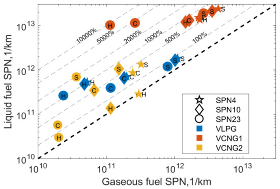 SPN measured in liquid fuel operation as a function of SPN measured in gaseous operation. Data labels in or next marker refer to 23 °C hot start (H, circle) or cold start (C, diamond) or to sub-zero (S, star) tests. Blue markers are for LPG, red for VCNG1 and yellow for VCNG2.