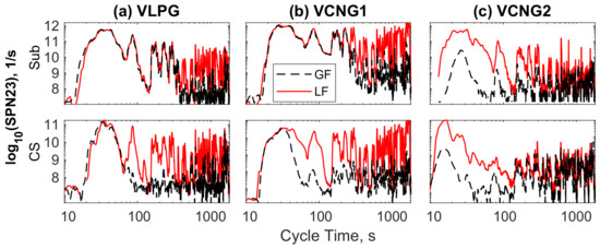 Sub-zero (Sub, top) and 23 °C cold start (CS, bottom) SPN23 time series with liquid (LF) and gaseous (GF) fuel in sub-zero tests for (a) VLPG; (b) VCNG1; and (c) VCNG2.