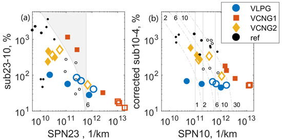 Particle fractions below 23 nm. Data measured with gaseous fuels is presented with filled markers and data for liquid (gasoline) with open markers; (a) sub23-10 fraction for uncorrected SPN10 as a function of SPN23. Shaded area marks data for which SPN10 is above limit 1/km, while SPN23 is below the limit; (b) sub10-4 fraction for corrected SPN4c as a function of SPN10. Grey vertical lines show SPN10 levels and curved, dash-dotted lines SPN4c levels. Labels 1, 2, 6, 10 and 30 refer to emission level multiples of 1/km. Data labelled ref is acquired from literature [13] and represents in left axes corrected sub23-10 and in right axes corrected sub10-2.5 levels instead of sub10-4.