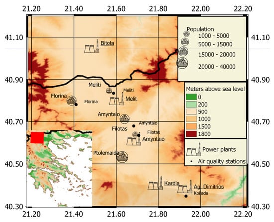 The topography of Northwest Greece is shown in Figure 1. In the centre of the area, a basin is located in 650 m above mean sea level, which is about ~50 km long and 10 to 25 km wide, surrounded by mountains of around 1350 m above mean sea level. Inside the basin, small hills are present. Vegetation is restricted to isolated trees and small bushes []. Four lignite-burning power plants (annotated in Figure 1), operated by the Greek Public Energy Corporation, are located in this basin, and use lignite from nearby open-pit coal-mines. In terms of total installed capacity, the biggest plant is Ag. Dimitrios (~1450 MW; 40.3920°N, 21.9280°E), located in the southeast of the region, followed by Kardia (~1100 MW, 40.4089°N, 21.7857°E), Amyntaio (~550 MW, 40.6178°N, 21.6858°E) and Meliti (~290 MW, 40.8153°N, 21.59829°E). In addition, one more lignite power plant, near the city of Bitola (~680 MW), is operating close to the border with the neighboring Republic of North Macedonia. The climate of the area is continental Mediterranean, characterized by high temperatures in summer and low temperatures in winter, while the prevailing winds during summer in the centre of the basin are mainly of NW, NNW and WNW directions (16.4, 15.6, and 9.9%, respectively) []. Nevertheless, the wind direction in the southern part of the basin is NE, dominated by the topography of the region. The villages and towns located in and around the basin, and their population are also shown in Figure 1. Finally, the locations of in situ air quality stations operating in the area are represented by black dots on the map.