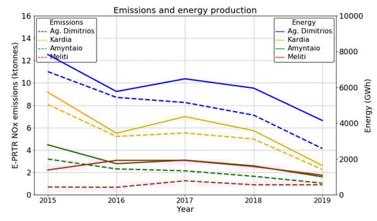 The Greek National Energy and Climate Plan (NCEP, https://ec.europa.eu/energy/sites/ener/files/el_final_necp_main_en.pdf, accessed on 8 July 2021) is a well-developed strategy that provides environmental objectives, policies and measures. The NCEP integrates the targets set in the Directive 2016/2284/EC concerning the reduction of national emissions of certain atmospheric pollutants, such as NOx, SO2 and NMVOC. Greece’s commitment regarding NOx emissions is a reduction of 31% for the period between 2020 and 2029 and a reduction of 55% after 2030 compared to 2005. According to the European Pollutant Release and Transfer Register (E-PRTR), the region of western Macedonia in Northwest Greece, reported the largest NOx emissions from lignite power plants (about 60 kt) for 2007 followed by the Aegean Sea islands and Crete. NOx emissions in the region of Northwest Greece are reported to decrease significantly in the following years, declining to ~17 kt in 2017. In this work, we hence focus on the regions of Northwest Greece, which hosts four of the largest lignite-burning power plants in Greece.