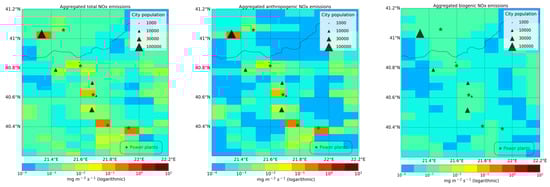 The total a priori anthropogenic and biogenic emissions, used for the simulations in the summer of 2019, are shown in Figure 3. The power plant locations are identified by the green star symbols. The black triangles represent cities, the size of the triangle is proportional to the population.