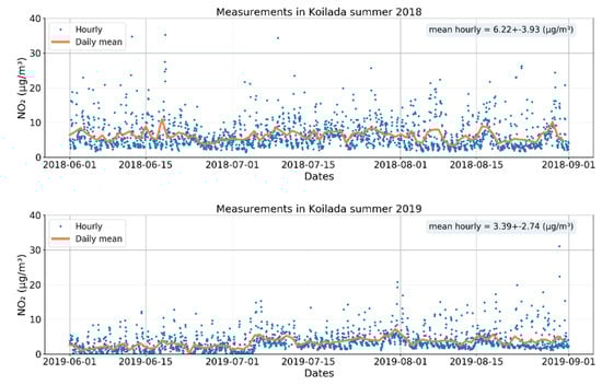 Time series of NO2 hourly measurements (blue dots) at the station of Koilada and the daily mean NO2 (orange line) for the summer of 2018 (top) and 2019 (bottom).