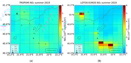 For the summer of 2019, the averaged NO2 tropospheric columns as observed by S5P/TROPOMI are shown in Figure 5a. The corresponding model NO2 values after the AK of the satellite retrieval are applied are shown in Figure 5b. The same figures for the summer of 2018 are shown in Figure S4. The number of available daily satellite observations over the two larger power plants is lower in 2018 compared to 2019, with ~53 and ~70 pixels, respectively. The retrievals and the simulations show similar spatial distributions, with higher values around the two largest power plants, Ag. Dimitrios and Kardia. However, large discrepancies in the absolute values of NO2 are found around the larger power plants where LOTOS-EUROS overestimates NO2 in comparison with S5P/TROPOMI observations. During the summer of 2019, LOTOS-EUROS simulates an average column of about 9 × 1015 molec cm−2 while TROPOMI observes about 2 × 1015 molec cm−2 over the same grid cell where Ag. Dimitrios is located (Table 2). A high model bias is also found over the power plant of Kardia (bias of 4.5 × 1015 molec cm−2), whereas the discrepancy is negligible over the small Meliti power plant. The column simulations are lower for the summer of 2018 than for the summer of 2019 (Figure 6) even though the a priori emissions used are the same. This can be attributed to the different meteorological conditions taking place that affect the NO2 levels together with the different number of daily available satellite observations.