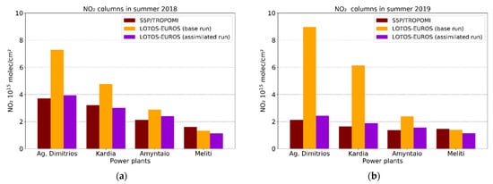 After assimilation, the LOTOS-EUROS columns are decreased as expected (Figure 6). The biases between the assimilated columns and the observations over the four power plants are lower than 0.6 molec cm−2 for both 2018 and 2019. In the grid cell where Ag. Dimitrios is located, the average NO2 column in the summer of 2019 (2018) in the assimilated run is about 2.4 × 1015 molec cm−2 (4 × 1015 molec cm−2), while TROPOMI observes about 2 × 1015 molec cm−2 (3.70 × 1015 molec cm−2) during the same period.