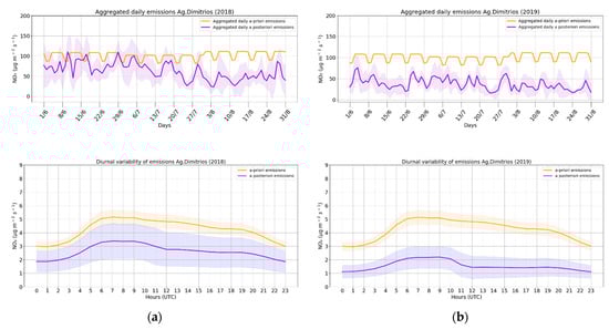 (Top): Aggregated daily NOx a priori (orange line) and a posteriori (purple line) emissions and the propagated uncertainty (shaded purple area) derived from S5P/TROPOMI assimilation over the Ag. Dimitrios power plant (a) for the summer of 2018 and; (b) the summer of 2019. (Bottom): Diurnal variability and standard deviation of the same emissions.