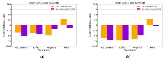 Relative differences of E-PRTR annual reported emissions (orange bars) and the assimilated annual emissions (purple bars) (a) for 2018 and (b) 2019, both with respect to E-PRTR 2015 reported emissions.