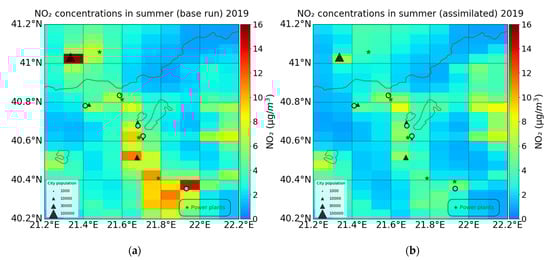 In order to validate the a posteriori NOx simulations, surface NO2 concentrations simulated using the a priori emissions (base run) and the TROPOMI-based emissions (assimilated run) are compared with hourly in situ NO2 measurements. In Figure 9, the mean summer surface NO2 as simulated by the base run (left) and the assimilated run (right) are shown together with the mean summer NO2 values of the in situ stations in 2019 (Figure S10 for 2018), depicted as colored circles. The assimilated NO2 concentrations are reduced over the whole region and especially around the power plants of Ag. Dimitrios and Kardia compared to the base run (Figure 9 and Figure S10).