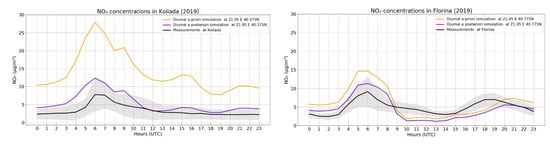Diurnal variability of the simulated NO2 surface concentrations using the a priori emissions (orange lines), the a posteriori emissions from the S5P/TROPOMI assimilation (purple lines) and in situ measurements (black lines) of the station Koilada (left) and Florina (right) for the summer of 2019.