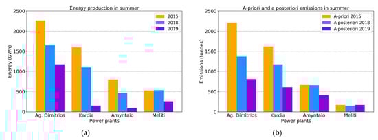 The total energy production per power plant for the summer period studied in years 2015, 2018 and 2019 is shown Figure 11a together with the a priori emissions in summer based in 2015 CAMS-REG emission inventory and the assimilated NOx emissions for 2018 and 2019 in Figure 11b. The energy production of the Ag. Dimitrios, Kardia and Amyntaio power plants decreases in 2018 and 2019 compared to 2015. These reductions are in accordance with the reductions found in the corresponding a posteriori NOx emissions (Figure 11b). It is also shown that energy production and NOx emissions in 2019 are even lower than in 2018. The relative differences between the a priori and a posteriori emissions directly compared to the relative differences between the power plant energy productions are shown in Table 5 for 2018–2015 and 2019–2015. Over the two larger power plants (Ag. Dimitrios and Kardia), the changes in energy and emissions are consistent for both 2018 and 2019. Larger decreases are found for both energy and emissions in 2019 compared to 2018 as well. In the case of the Meliti power plant, the emissions remain nearly the same, despite the fact that the energy production in 2019 is twice lower than in 2015 and 2018. Overall, the emission reduction is even more pronounced in 2019 compared to 2015 at the three largest power plants of Ag. Dimitrios, Kardia and Amyntaio and this is further confirmed by the reduction of the energy production in the same year that reaches at least 50%.