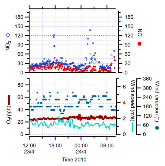 Instead, on other days, the variability of NO and NO2 concentrations was mainly due to local emissions. During 18% of the time of this campaign, NO and NO2 peaked to the highest encountered concentrations (4, 6, 7, 9, 11, 13, 24, 25 and 26 April 2011). The local winds were low (<1 m/s) and were connected to northerly directions, confirming the influence of the local power station on NOx measurements [7,23].