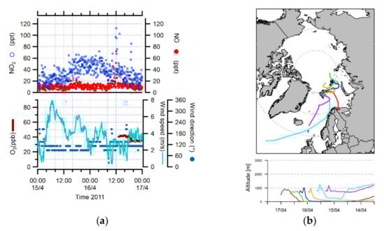 However, high NO and NO2 concentrations were also connected with an air mass pathway from Europe on one episode, on 15–16 April 2011. During this long-range transport event, NO and NO2 peaked up to about 130 and 230 ppt, respectively. The local wind speeds ranged from 2 to 16 m/s and were mostly associated with the south direction (Figure 3a,b).