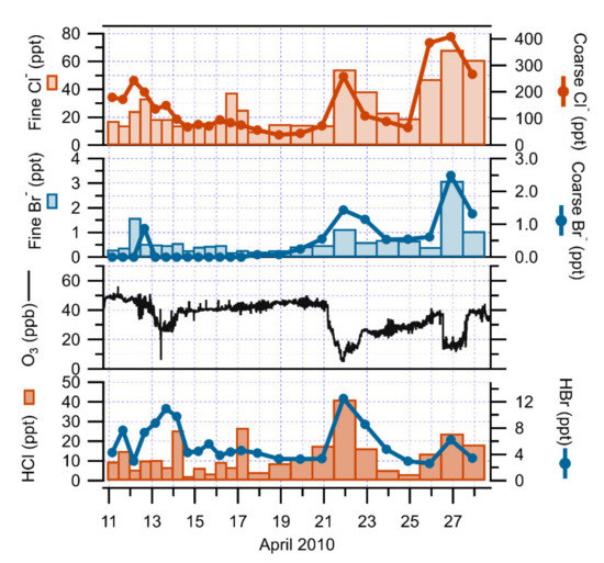 An increasing trend of halogen species collected on an annular denuder and filter pack system was also noted during the O3 depletion events of 2010 at Ny-Ålesund (Table 2). During the 2010 campaign, chlorine species were predominantly distributed in the particulate phase, while bromine species were mostly found in the gaseous phase (Figure 4). However, at the beginning of the campaign, the coarse particulate was almost undetectable, while the mean O3 was around 45 ppb. At the onset of the drop in O3 concentrations, the coarse particulate concentrations gradually increased up to 1.5 and 2.5 ppt on 21 and 26 April 2010. HCl, coarse and fine , HBr and fine also exhibited similar behaviors, peaking simultaneously during these ozone depletion periods. The O3 concentrations were linearly and negatively correlated with inorganic bromine and chlorine compounds, showing a correlation coefficient (R2) of 0.8 and 0.4 for HBr and particulate , and of 0.6. and 0.3 for HCl and particulate . Using sodium (Na) as a seawater reference element, and, thus, as a sea-salt tracer with a corresponding Br/Na mass ratio value of 0.006 [40], the mean values of the measured Br/Na mass ratios in particulate matter collected by the denuder/filter pack system were 0.01 and 0.03 during the all sampling and ozone depletion periods. Thus, particulate Br- was shown to be in excess in relation to solely sea-salt inputs by a factor of about 2 and 5. The enrichment of Br relating to Na could be due to ocean or sea-ice processes, suggesting that sea-salt could be the source of halogen compounds responsible for the ozone depletion events [41,42]. Indeed, the measured Cl/Na mass ratios were lower than the sea-salt ratio (1.8), with a mean value of 1.4 and 1.3 during all sampling and ozone-depletion periods. These depletions of from expected sea-salt chloride could be due to reactions of sea-salt particles with acidic species (acid displacement), such as sulfuric acid (H2SO4) or nitric acid (HNO3) [43,44], as already determined at Ny-Ålesund [45,46]. The observed increase in halogen compounds suggested the presence and involvement of the Br chemistry in the ozone depleted events in Ny-Ålesund, as in previous studies [47,48,49].