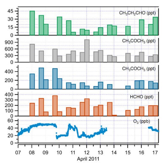 The carbonyl compound data during the partial ozone depletion events were rather sparse, because the samples were taken only twice daily, and the sampling times were not coordinated to examine the ozone depletion event. Only five samples for each carbonyl compound were taken during the last two ozone-depletion events (9–10 and 11–12 April 2011) (Figure 5). An evaluation on the behavior of carbonyl compounds during the ozone depletion periods is difficult from this dataset. However, during decreasing O3 conditions, acetaldehyde and propanal concentrations decreased to 72 and 7 ppt respectively, showing significant positive correlations with O3 (R2 = 0.6, p < 0.001, and 0.7, p < 0.001). This suggested the involvement of local Br-driven chemistry, resulting in aldehyde concentration reduction during the ozone depletion events. Contrary to other aldehydes, HCHO was inversely correlated with O3 (R2 = 0.8, p < 0.001), in agreement with previous studies. Formaldehyde concentrations were shown to increase, reaching a high value of 330 ppt. A reason for this behavior has been demonstrated [56,57], indicating that during partial ozone episodes, more chlorine (Cl) than bromine (Br) atoms are available, and enhanced production of HCHO by gas-phase oxidation of methane (CH4) with Cl atoms could be a viable explanation. Concurrent hydrocarbon and halogen data were not available for this field campaign. A negative correlation between acetone and O3 was also observed (R2 = 0.3, p < 0.01) with an increase in acetone concentrations up to about 1 ppb. Enhanced production of acetone from gas-phase oxidation of propane by Cl atoms could be one possible reason [53,58].