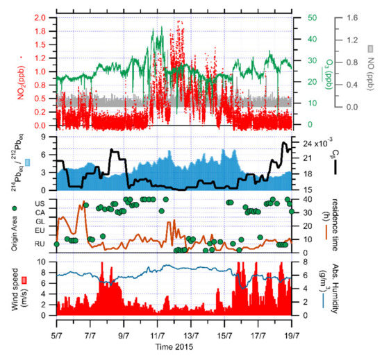 Time series of NO, NO2 and O3 concentrations, together with isotopic composition of radon progeny (short-lived progeny/long-lived progeny ratio, 214Pbeq/212Pbeq, and very-long-lived component, Cβ), origin (US—NW United States; CA—Canada; GL—Greenland; EU—NW Europe; RU—Russian Federation) and residence time of air masses, wind speed and the absolute humidity during the biomass burning event in July 2015 at Ny-Ålesund.