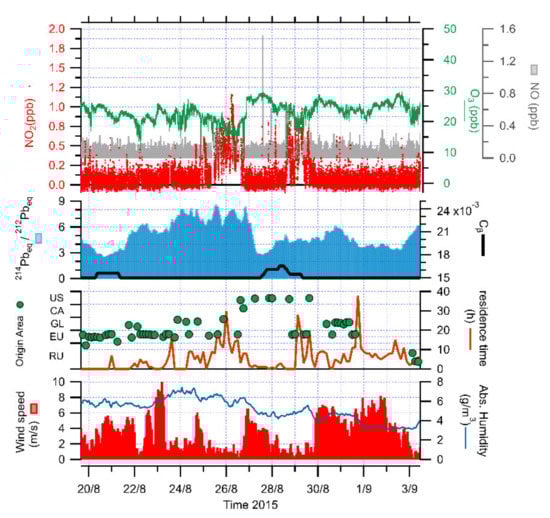 Time series of NO, NO2 and O3 concentrations, together with isotopic composition of radon progeny (short-lived progeny/long-lived progeny ratio, 214Pbeq/212Pbeq, and very-long-lived component, Cβ), origin (US—NW United States; CA—Canada; GL—Greenland; EU—NW Europe; RU—Russian Federation) and residence time of air masses, wind speed and absolute humidity during a sequence of stability conditions in August 2015 at Ny-Ålesund.