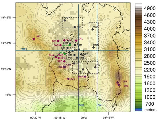 We use hourly surface meteorological variables from a network of 24 meteorological stations belonging to the Atmospheric Monitoring Agency of Mexico City (Secretaría del Medio Ambiente, SEDEMA). Additionally, 12 automatic meteorological stations maintained by the Mexican National Weather Service (Servicio Meteorológico Nacional, SMN) complete the observational surface network (Figure 1). Concerning upper levels, data is available from a 915 Mhz Doppler radar wind profiler (RAWP) (see Lau et al. [25] for technical details) maintained by SEDEMA. Note that the RAWP is located near the northern border of Mexico City limits (green dot in Figure 1) in a downward slope between two mountain ranges where a northwesterly gap wind usually develops. The RAWP outputs horizontal wind components as function of height above the basin floor and has an approximate vertical resolution of 60 m with a temporal resolution of 6 min and a range of about 3 km above ground level. Thus the RAWP can sample air well within the atmospheric boundary layer of the Mexico Basin. In addition, a radiosonde denoted here as RAS is available twice daily at 0600 and 1800 LST is launched from the headquarters of the SMN (lat: 19.4° long: 99.2° W elevation: 2313 m agl) in the northwest part of Mexico City (Figure 1). The surface database is subjected to a data quality control including time series homogeneization of temperature data. Table S1 (Supplementary Material) summarizes the surface station data. The air quality network from SEDEMA provides hourly ozone data. In addition to the above data, we use ECMWF ERA 5 reanalysis to analyze prevailing synoptic conditions and to obtain initial and boundary conditions for the regional atmospheric model as described below.