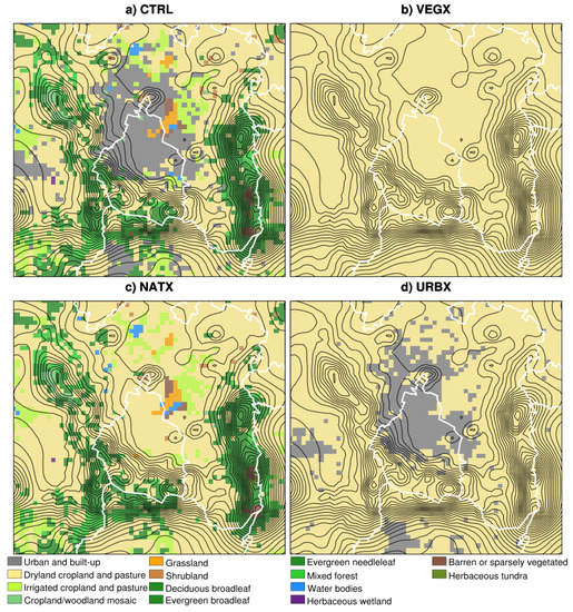 To explore the urban effect (UE) on local circulation and UHI development, we propose three hypothesis testing experiments in the D03 domain with modified LULC from the CTRL experiment: (1) VEGX experiment, where the LULC from the CTRL is replaced completely by the DCP LULC category (2) URBX experiment, same as VEGX except that the CTRL’s urban and built-up category is superposed onto the VEGX’s DCP category, and (3) NATX experiment, same as CTRL but with its urban and built-up LULC category replaced by the dominant DCP category. For comparison, Figure 2 shows, the geographical distribution of LULC in the hypothesis testing experiments described above, including the CTRL. The CTRL and the three hypothesis testing help define two meaningful UE: the difference (CTRL-NATX) is the UE keeping the LULC heterogenous, and the difference (URBX-VEGX) is the UE keeping the LULC homogeneous (since the DCP category is in both URBX and VEGX). The hypothesis behind these two UEs is that the difference (CTRL-NATX) is more complex than its counterpart (URBX-VEGX) since inhomogeneous LULC surface conditions can generate mesoscale eddies within the PBL that can impact the local circulation effectively. To further investigate the UE on the three dimensional local circulation patterns in the Mexico Basin we use moist static energy () defined as: , where is the latent heat of vaporization (2.5 × 10 J kg), q the specific humidity, and is enthalpy (J kg) and is potential energy per unit mass. is conserved following non-condensing adiabatic motion of the parcels [38]. Synoptic and local circulations for this case study restrict the conversion of water vapor into condensed water(except possibly during ascend of moist air up the mountain slopes), and the only significant sources or sinks of water vapor q and lie at the lower boundary and the lateral walls of the computational volume domain of the model.