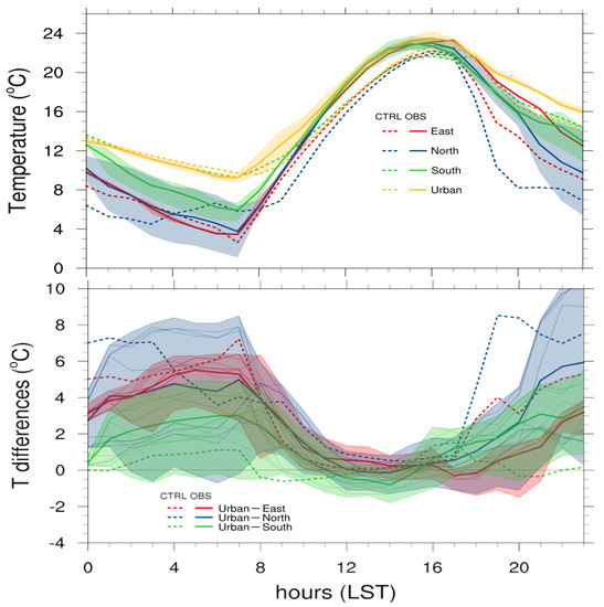 Diurnal cycle of temperature (°C) (upper panel) and UHI intensity (°C) (lower panel) for 10 February 2017. Full lines represent observations while dotted lines represent the CTRL model simulations. Upper panel shows the comparison between the observations and the model at four areas: East, North, South, and Urban as defined in the text. Lower panel shows the UHI intensity as the temperature differences between the Urban area and the other three areas. The shading corresponds to the spatial variability from stations within each area.