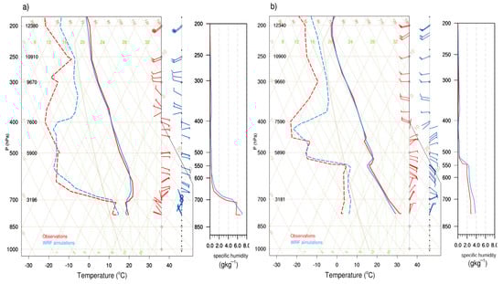 Skewt diagrams for February 10, 2017 at (a) 0600 LST and (b) 1800 LST. In color red the vertical profile of observed temperatures (°C) and horizontal wind vectors in m s (right columns). In blue the corresponding CTRL simulation variables. The right-most column panels shows the vertical profile of specific humidity (g kg).