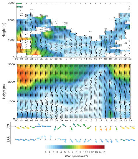 Height versus time horizontal of observed and modeled horizontal Wind profiles for 10 February 2017 at the location of the Radar Wind Profiler (upper panel), the corresponding nearest grid point from the CTRL simulation (middle panel), and the two nearest weather stations to the Radar Wind Profiler site, LAA and 059 (lower panel). The magnitude of the wind in the CTRL, the RAWP and the wind field from the two stations is represented by the color bar in the lower panel.