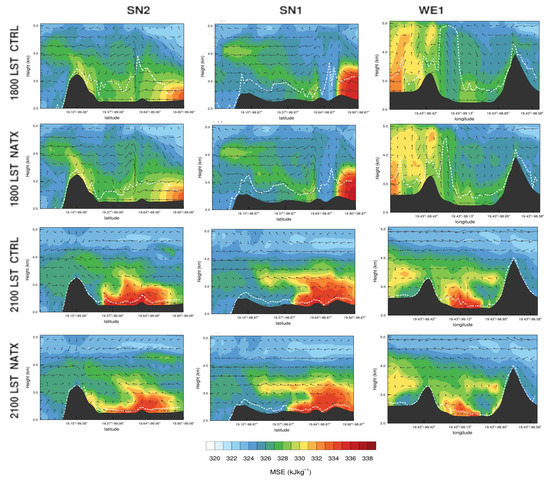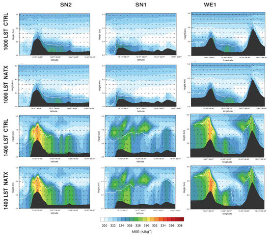 Vertical cross-sections of moist static energy in the CTRL, and NATX simulations for 10 February 2017 at 1000, and 1400 LST. Each panel column represents a transect as defined in Figure 1. The wind field pattern is represented by the vertical and meridional components of the wind for the south-north transects (SN1, and SN2) and zonal wind component for the west-east transect (WE1). In order to facilitate inspection of the fields, the vertical wind component is multiplied by a factor of 10 and the vertical scale is exaggerated compared to the horizontal scale. The white line represents the height in m amsl of the PBL, from the model simulation.