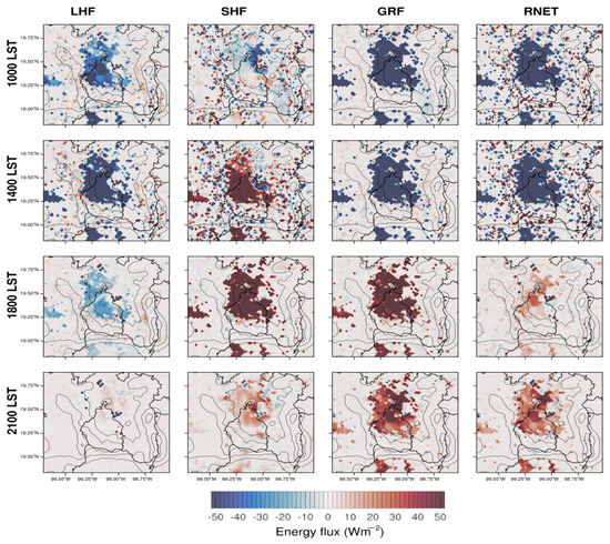 Figure 9 shows, the UE as differences between the CTRL and NATX experiments in latent heat flux (LHF), sensible heat flux (SHF), ground flux (GRF), and net radiation at the surface (RNET). We interpret (following [47] p. 251) positive fluxes as going into the atmosphere and negative otherwise. In the morning-afternoon (1000, and 1400 LST) the RNET difference is negative implying, that RNET for NATX is larger (i.e., less negative) than RNET for the CTRL. At this time, SHF is positive for both CTRL and NATX, and very close to each other in magnitude at 1000 LST. However, at 1400 LST, the SHF of CTRL surpasses that of NATX by about 40 W m as Figure 9 shows in the SHF panels. At this time, the LHF in the CTRL simulation is very small in absolute value while that of the NATX experiment is positive (not shown) leading to negative differences in LHF between the CTRL and NATX simulations. At 1400 LST this negative difference in LHF increases. This increase in LHF is in agreement with larger values of near the surface as Figure 7 shows for NATX at 1400 LST. Next, we examine the night period (1800, and 2100 LST). The positive difference in SHF implies the CTRL has a larger SHF than NATX, as expected, during this part of the diurnal cycle with values larger than 45 W m with maxima at 1800 LST as Figure 9 shows in the SHF column. The response in can be seen in all transects at 2100 LST with larger values of for the CTRL near the surface compared to NATX (see Figure 7). Finally, the UE in this very simple model of urban area is interpreted as the difference in energy storage by the urban and built-up category in the CTRL and the NATX experiment. In the morning-afternoon period, the GRF is negative, and Figure 9 shows the CTRL to be more negative than NATX as expected since the urban and built-up area is expected to store more energy than the DCP category during the day. At night, the GRF becomes positive for both CTRL and NATX experiment but this time, the difference in GRF is positive meaning that the urban and built-up area is giving off energy to the atmosphere at a greater rate than the DCP category. Figure S7 in Supplementary Material shows the homogeneous UE for the URBX and VEGX experiments.