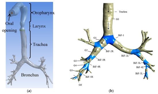 HRT model from the oral cavity to sixth-generation bronchi with bronchial bifurcations and generations. (a) HRT Model; (b) Bronchial bifurcations (BiF) and Generations (G).