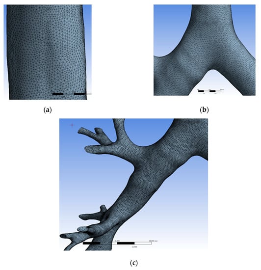 Figure 2a–c shows the close-up view of the computational grid in different parts of the human respiratory tract model. The division of large computational domains into the small sub-domains is called the mesh or grid. The quality of the mesh is a significant factor for CFD analysis of any computational problem. The mesh should be fine where the flow area is changed and where eddies/turbulence are formed. The quality of the mesh is identified by the skewness; close to zero is better for CFD analysis, but Ansys-Fluent can solve up to 0.95 skewness. The patch-independent method provided in the Ansys-Mesh Modeller (Ansys Inc., Canonsburg, PA, USA) is adopted for grid generation, which uses a top-down approach (i.e., generated mesh from volume to surface). Since the surface of the respiratory tracts is curved, surface meshing is generated using triangular mesh, and volume grid is generated using structured tetrahedral elements. In order to have a high-density mesh at the bifurcations of the HRT model, the edges near the bifurcation have meshed with a layer at a 1:1 growth ratio.