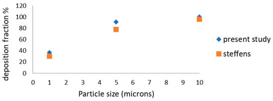 The deposition of toxic cigarette smoke particulates (CSP) is computed for a variety of particle sizes at a constant flow rate of 2.25 LPM. The value of deposition is shown in Figure 6 in terms of total deposition fraction percentage, and the computed data is compared with the data reported by Steffens [36]. An excellent agreement is observed for particle sizes 1 and 10 µm, while little difference in the deposition fraction percentage is noticed for 5 µm particles. Overall, the present data is validated by the published data.