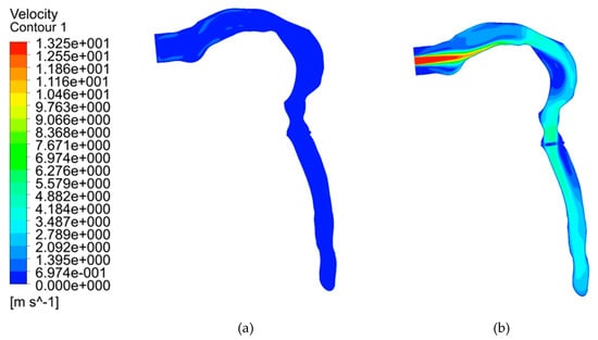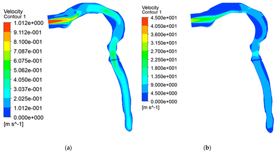Velocity contour. (a) Transient puffing; (b) Transient post-puffing inhalation.