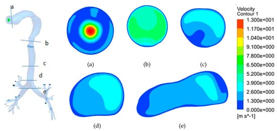 The streamwise velocity contours at various transverse planes in the HRT model are shown in Figure 12 at different instants. It is noteworthy that the color index for velocity used in Figure 11 is also applicable here. The inhalation phase is maintained up to t = 1.9 s, whereas the exhalation continued until t = 4.1 s. Maximum velocity during exhalation (Figure 12e) is higher than that during the inhalation (Figure 12b).