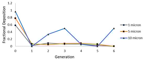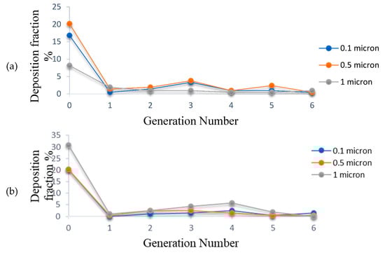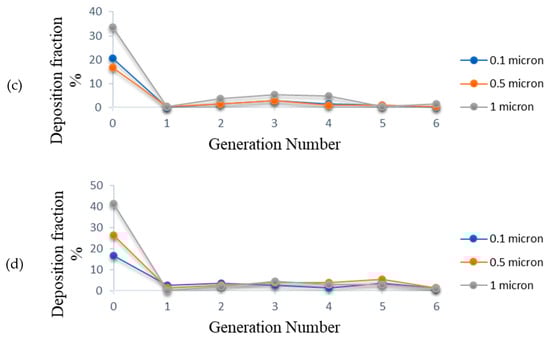 The deposition fraction of the CSP is computed at various instants during the inhalation phase and is expressed in percentage terms in Figure 15a–d. It is observed from Figure 15a that at the onset of inhalation (t = 0.5 s), deposition fraction for 0.1 μm sized particles is higher at the 0th generation as compared to that for 1 μm sized particles, signifying that the particles are deposited mainly due to diffusion at low velocity. Hence, the effect of inertial impaction is more negligible in the low-velocity range. As the velocity increases with time, deposition for 1 μm particles increased at the 0th generation due to inertial impaction as compared to the diffusion effect.