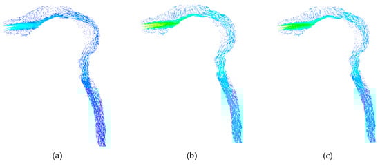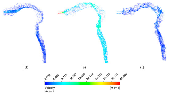 During smoking, fresh air is inhaled after puffing. Subsequently, the lungs exhale the air volume, and the same is shown in Figure 11 at different instants. Here, inhalation takes place up to the t = 1.9 s; after that exhalation starts, it continues until t = 4.18 s as per the waveform. The realistic waveform of inhalation and exhalation shows that the exhalation velocity is higher than the inhalation velocity. Velocity reaches 28 m/s at the time of inhalation (Figure 11b), but during exhalation, the air velocity reaches 44 m/s (arrow showing at the oral opening in Figure 11e). The laryngeal jet is gradually weakened and subsequently disappears due to the decrease in the inhalation velocity. As a result, the break-up of the vortex structure in the form of small eddies is noticed inside the HRT model just before the completion of the exhalation process (Figure 11f).
