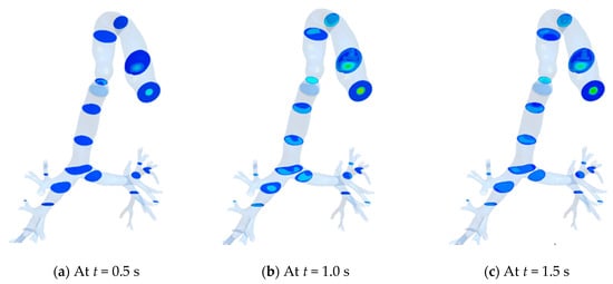 The propagation of toxic particles from the oral opening to the distal airways of the HRT model during the inhalation phase is shown in Figure 13a–f. The particles are shown here magnified for the sake of visualization to the readers. It is seen from Figure 13a that the inhaled toxic particles (CSP) formed a cone-shaped structure at the onset of smoking cigarettes.