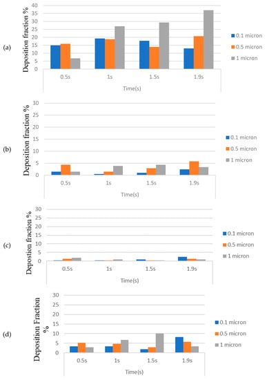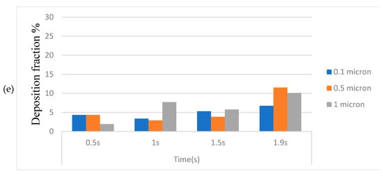 Figure 14a–e represents the deposition of toxic particles at different locations of the HRT model at different instants during inhalation for various particle sizes. The deposition is expressed in these graphs as deposition fraction (percentage). As the smokers started to inhale, smaller-sized toxic particles (0.1 μm and 0.5 μm) are deposited rapidly in the walls of the oropharynx and achieve a higher deposition fraction as compared to the larger particles (1 μm) due to diffusion. As time elapsed, the trend reversed, and the highest deposition fraction is computed (~37%) for 1 μm particles at the end of the inhalation phase due to inertial impaction.
