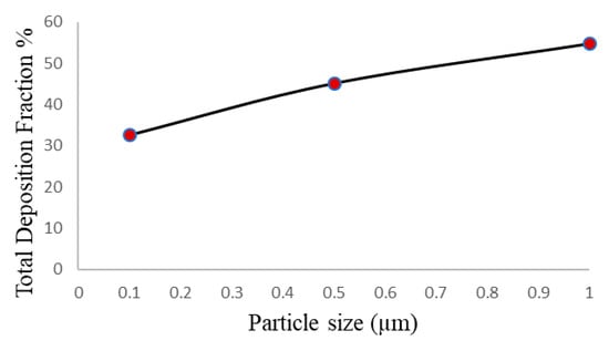 It is revealed from Figure 16 that the total deposition fraction percentage of cigarette smoke particles (CSP) is at its maximum for particles sized 1 μm, while it is at its minimum for particles sized 0.1 μm. It can also be seen from the figure that the CSP can be deposited up to 54.8% with a single puff of a cigarette.