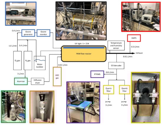 The PAM OFR used in the current study is a Penn State PAM, which is developed by the Pennsylvania State University. The reactor is 45.7 cm long, with an inner diameter of 19.7 cm, resulting in a volume of around 13 L. A UV lamp (BHK Inc., Ontario, CA, USA) is mounted inside the reactor, providing UV radiation at 254 nm only. PAM OFR of this type is usually termed OFR254 to differentiate from its counterpart OFR185, of which the UV lamp inside the reactor produce radiation at both 185 nm and 254 nm. Detailed principals and characterization of the PAM OFR in the current study can be found elsewhere [17,28]. Briefly, the main oxidant in PAM, OH radical, is generated inside the reactor by the reaction between water vapor and excited oxygen [O(1D)] atom. The excited oxygen [O(1D)] atom is produced as a result of the irradiation of O3 by UV light at 254 nm inside the reactor. O3 is externally generated, and injected to the reactor in prior to the injection of VOC.